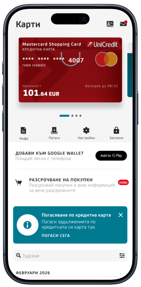Преди да сте се уморили, ето още една бонус точка, защото вече всички картодържатели с активна кредитна карта разполагат и с бутон „Погаси“, който позволява бързо и удобно погасяване на задълженията. Това дава свобода плащанията да се извършват по всяко време и място, което носи допълнително спокойствие.